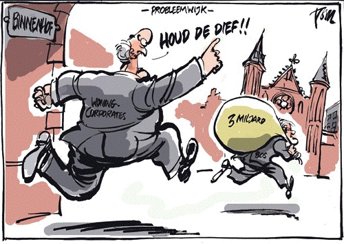 ‘Ik ben zeer te spreken over de investeringen van de corporaties.’ Dat verklaarde de Hilversumse wethouder Hammer gister in de krant. Vanochtend had ik overleg met onze Huurdersbelangen Vereniging waarin zij ons ondersteunden in de strijd tegen minister Wouter Bos. Bos wil ons geld gebruiken voor het vullen van gaten in zijn begroting. Mijn humeur was goed. Maar nog geen kwartier later was dat voorbij. Het kabinet komt het geld gewoon weggraaien en laat ons bovendien meer belasting betalen dan commerciële partijen. Ik begrijp er niets meer van. Gelukkig sta ik daarin niet alleen. Ook de Woonbond vindt het ‘beschamend’ dat corporaties aan Bos moeten betalen. Maar zou het kabinet zich daar iets van aan trekken?