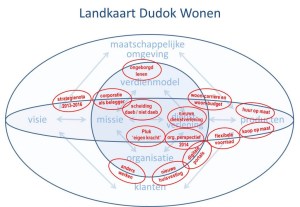 Bij deze werkwijze is ons bedrijfsmodel (zie mijn vorige weblog) een hulpmiddel. Door hierin alle initiatieven te plaatsen, ziet iedereen in één oogopslag waar iets gebeurt. Het stelt mensen in staat om, daar waar nodig, samenwerking en afstemming te zoeken. Voor het management fungeert het als een landkaart voor vernieuwing. De landkaart vindt u hiernaast.