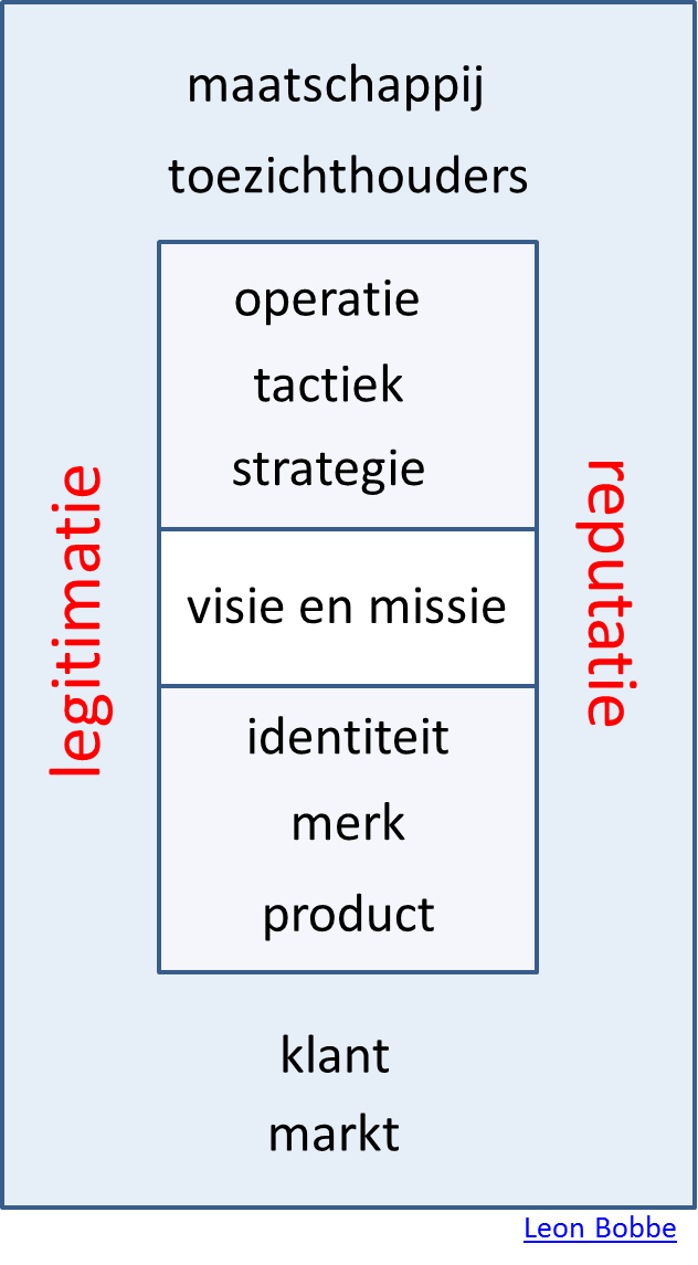 Deze reacties heb ik gebruikt om het schema wat te verbreden. In het midden van mijn nieuwe schema staat hetgeen een corporatie rechtstreeks kan beïnvloeden. Daarom heen staat het domein waar je minder invloed op hebt en waar de reputatie wordt gevormd en de legitimatie moet worden verkregen.