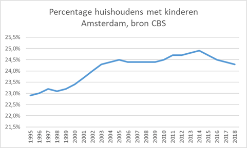 Nu zegt dit getal niet alles. Je kan dit ook afzetten tegen de groei van de stad. Maar ook dan laat het CBS tussen 1995 en 2018 een lichte stijging van gezinnen met kinderen zien: van 22% naar 24,3% van het totaal aantal huishoudens. Redelijk stabiel dus, zeker als je het afzet tegen de enorme stijging van eenpersoonshuishoudens in Nederland. Dan zou je toch andere cijfers verwachten.