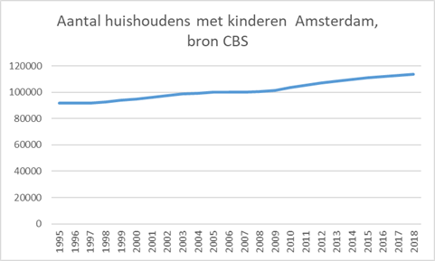 Maar leidt deze trek er nu ook toe dat in Amsterdam het aantal gezinnen met kinderen afneemt. Tijd om het CBS te raadplegen! Daaruit blijkt dat tussen 1995 en 2018 het aantal huishoudens met kinderen met bijna een kwart is gestegen.