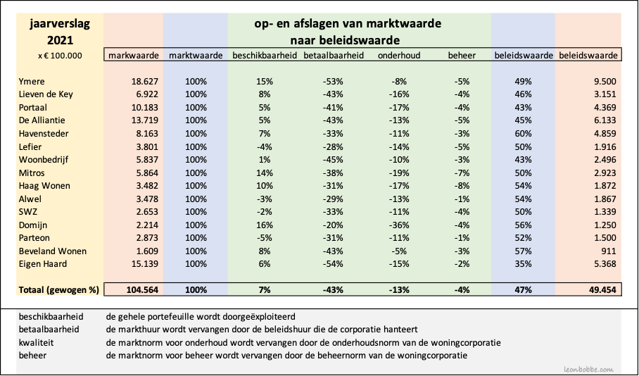 De omvang van stille reserve heb ik opgezocht in de jaarverslagen van 15 corporaties. Daaruit blijkt dat de beleidswaarde gemiddeld 47% is van de marktwaarde. Dat betekent een ‘stille reserve’ van € 55 miljard bij deze 15 corporaties gezamenlijk. Er zijn wel rekenverschillen tussen corporaties. Die zitten immers in verschillende markten en hebben verschillende ambities.