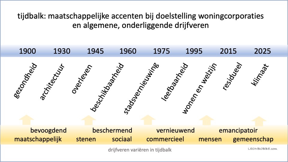 Terugkijkend in de tijd, bevat elke periode eigen accenten: het maatschappelijk doel beweegt in de tijd, de achterliggende drijfveren lopen daar per corporatie doorheen.