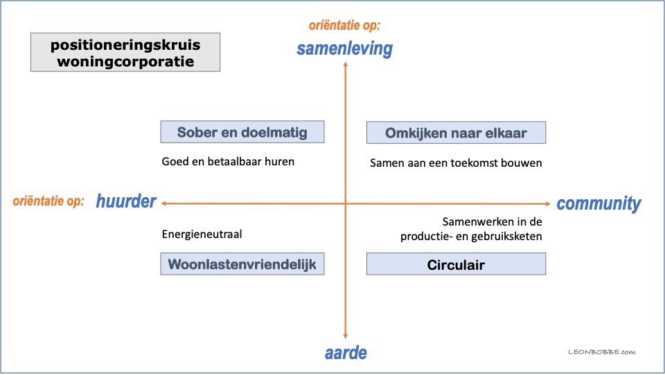 Door deze lijnen in twee assen te plaatsen, ontstaat een positioneringskruis waarin corporaties hun ambities of verbondenheid kunnen plaatsen. Dat plaatje ziet er als volgt uit: