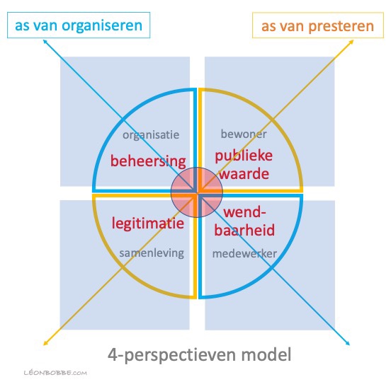 Om hierover meer inzicht te verkrijgen, is het ‘4-perspectieven model’ ontwikkeld. Centraal staan de ‘as van het organiseren’ en de ‘as van het presteren. In een assenmodel vormen ze vier kwadranten. Elke as representeert twee ‘tegenhangers’.