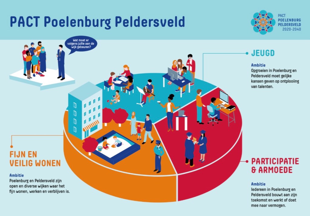 Al deze taaie vraagstukken worden aangepakt vanuit het PACT Poelenburg Peldersveld. De samenwerking tussen zo’n 30 partijen krijgt vorm door te werken vanuit de logica van de wijk, kort samengevat met ‘wat sluit aan en wat werkt’.