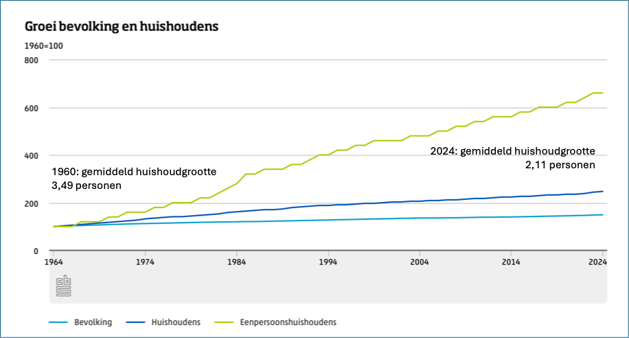 De echte reden is natuurlijk dat er te weinig wordt gebouwd door falend overheidsbeleid. Woningzoekenden kan je daar nooit de schuld van geven. Helaas schuift de overheid dat van zich af door de asielinstroom de schuld te geven. Maar de grootste aanjager van het woningtekort is dus de krimpende huishoudensgrootte. En daar speelt de stijging van het aantal eenpersoonshuishoudens een cruciale rol. Daarom staat er in de titel van deze blog dat de eenpersoonshuishoudens de woningnood aanjagen. Om tegenwicht te geven aan de eenzijdige framing van de overheid. En het is indirect ook een oproep om de woningnood te bestrijden door kleiner te bouwen (dan kan je meer woningen bouwen) en woningdelen te stimuleren.