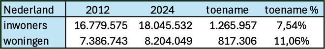 Sinds 2012 is de gemiddelde huishoudensgrootte met ongeveer 0,1 persoon gedaald. Die dalende huishoudgrootte heeft in twaalf jaar geleid tot een extra woningvraag van ca 390.000 woningen. Het eerder genoemde bouwoverschot van ca 215.000 woningen verandert daarmee in een tekort van ca 175.000 woningen in de periode 2012 – 2024, oftewel een tekort van ca 15.000 woningen per jaar. Het hele plaatje ziet er als volgt uit: