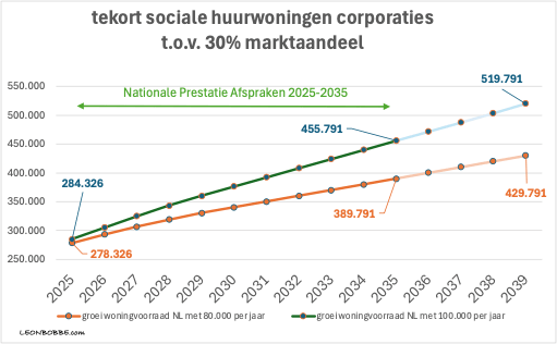 In 2024 was er al een tekort van ca een kwart miljoen sociale huurwoningen ten opzichte van het gewenste 30% marktaandeel, in 2035 loopt dat tekort op tot meer dan 400.000 woningen . En bij een ongewijzigde bouwtrend bedraagt dat tekort in 2039 zo’n half miljoen sociale huurwoningen.