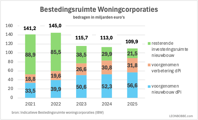Maar voorlopig toont de IBW ook positieve trends. Corporaties hebben de afgelopen vijf jaar steeds meer geld begroot (en uitgegeven) voor nieuwbouw en woningverbetering. In 2021 lag de bestedingsambitie op € 52 miljard, in 2025 is dit met 70% gestegen naar € 88,4 miljard. Er kon elk jaar nog meer geld worden uitgegeven, maar dat surplus werd in de loop der jaren steeds minder. In 2021 was er nog € 88,9 miljard ongebruikte bestedingsruimte beschikbaar, in 2025 is dat met 75% gedaald naar € 21,5 miljard.